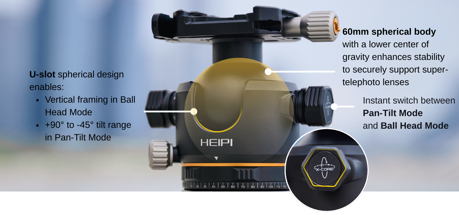 Compact ball head with dual modes, Pan-Tilt Mode & Ball Head Mode.
